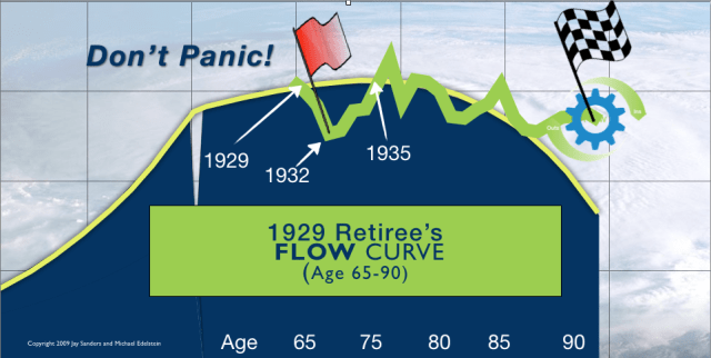 Arguably the 29 crash was the worst in our financial history and so the perfect test for “the 4% rule.” In the image below we’ve superimposed the flow of Bengen’s 1929 retiree on the curve to make the case. You’ll note by sticking to the plan, see far right, that retiree ended way above the curve.