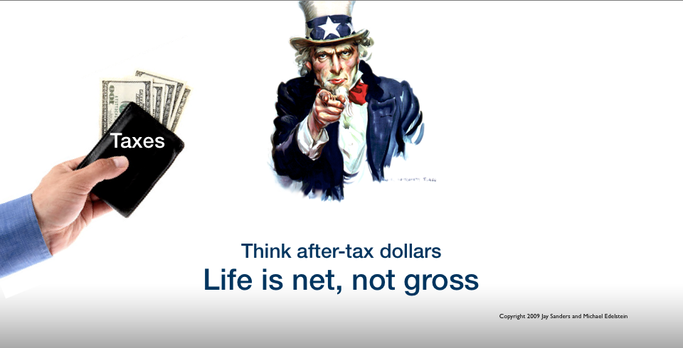 Depending on how much you make a dollar of gross pay translates into as little as a $0.50 net dollar. The bottom line is you need to be conscious that life has to be financed after tax, net not gross. You don’t pay your bills with gross dollars, you pay them net.