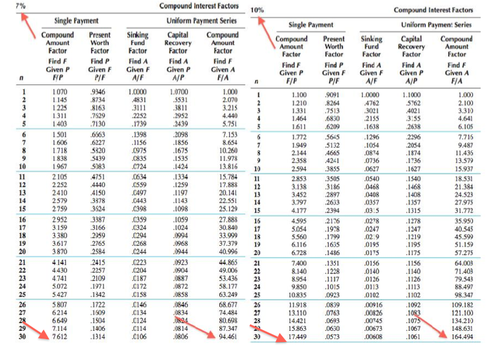 Back to the example.  The red arrows show what happens to $1 compounded over 30 years and $1 added annually per year over 30 years.  At 7% $1 grows to $7.61 after 30 years and $1 per year for 30 years grows to $94.46.  If we use a 10% factor the $1 grows to $17.45 ($17.45/$7.61) an increase of 229%.  The $1 per year to $164.49 ($164.49/$94.46) an increase of 174%.